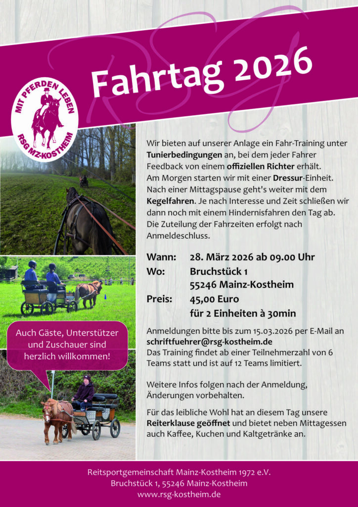 Wir starten im Februar zu Fastnacht mit einem lustigen Kostümtrail am 14.02., im März kommt am 22.03. unser allseits bekanntes und beliebtes Ponyreiten aus der Winterpause und nur eine knappe Woche später laden wir am 28. März zum ersten RSG Fahrtag für Kutschenfahrer*innen und natürlich auch begeisterte Zuschauer*innen!